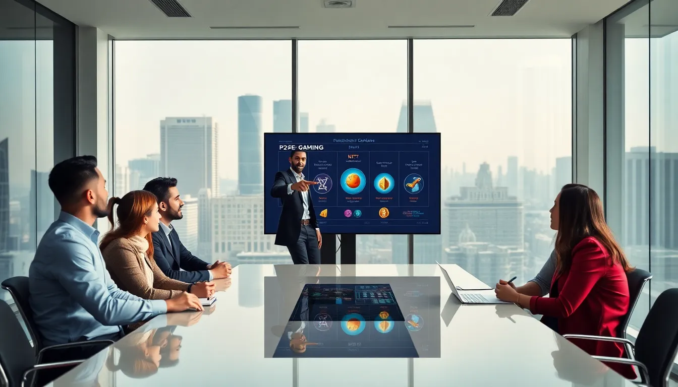 diverse team brainstorming P2E gaming ideas in a modern office.